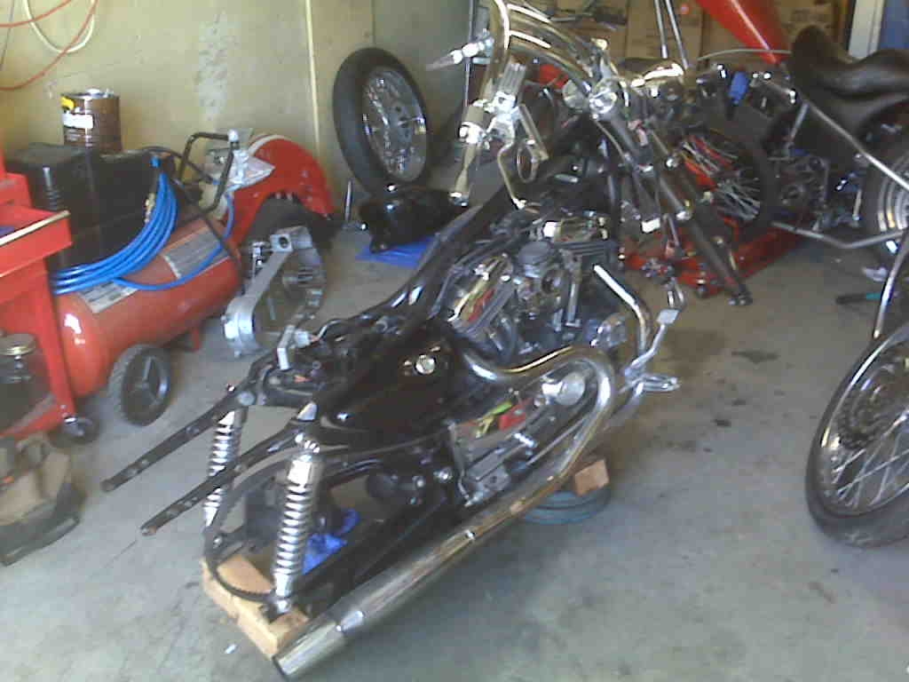 The weekend before Thanksgiving I go out to the garage to access the damage and start rebuilding...After ripping off everything that couldn't be salvaged and adding the handle bars from the chopper in the background, a straight swing arm and the thunder header 2 in 1 exhaust (got that for $100.00), I ended up with this thing here: