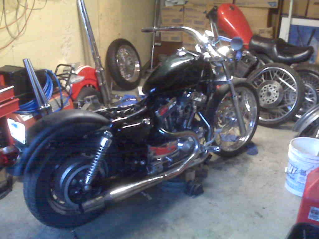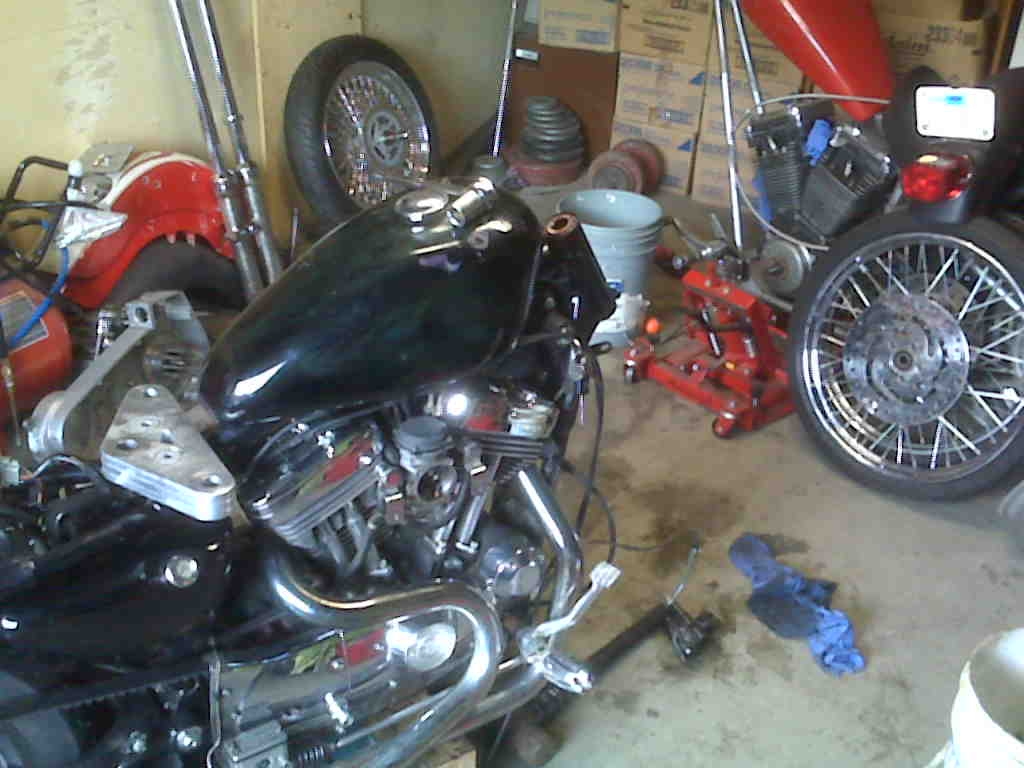 The weekend before Thanksgiving I go out to the garage to access the damage and start rebuilding...After ripping off everything that couldn't be salvaged and adding the handle bars from the chopper in the background, a straight swing arm and the thunder header 2 in 1 exhaust (got that for $100.00), I ended up with this thing here:
